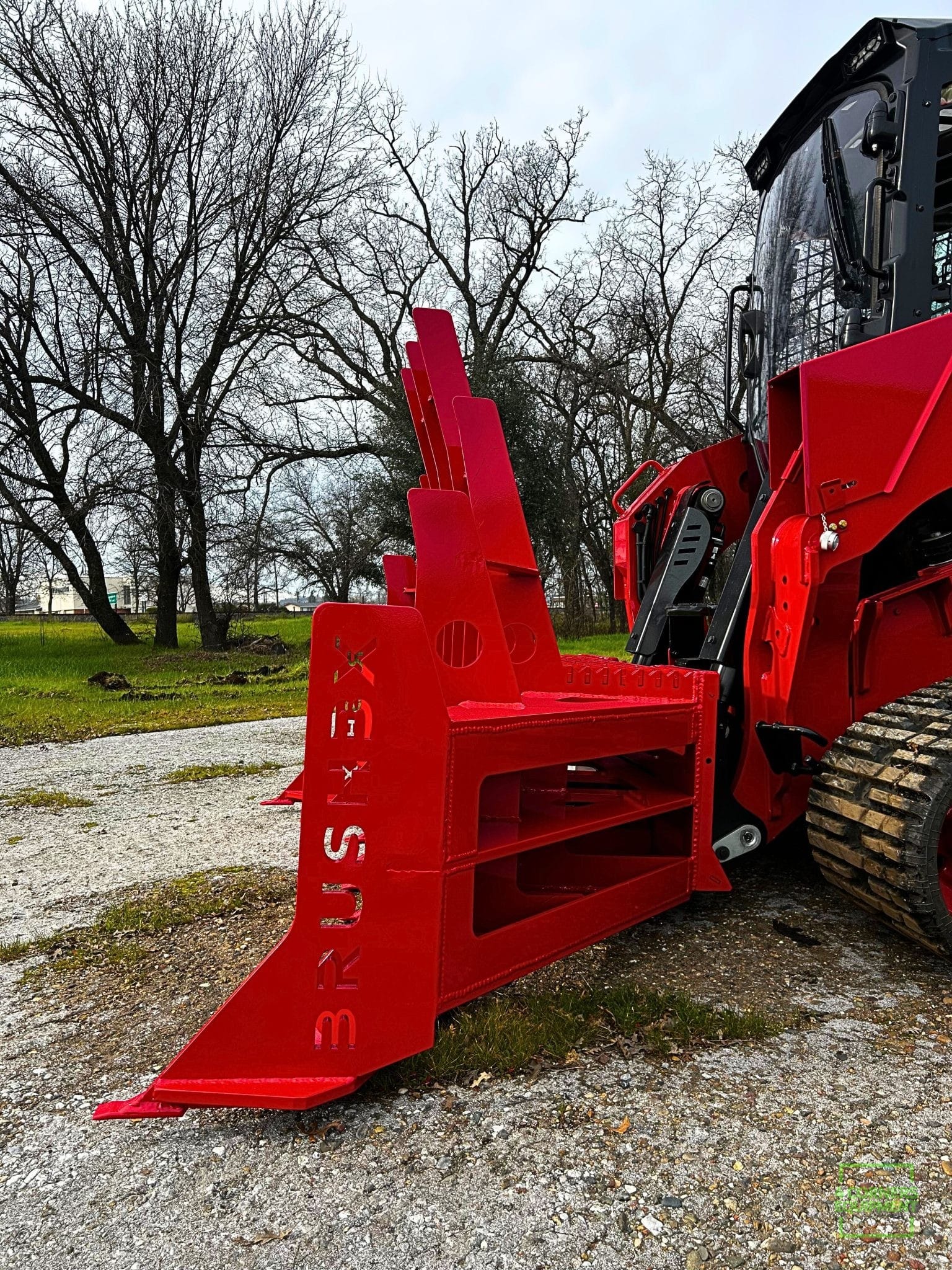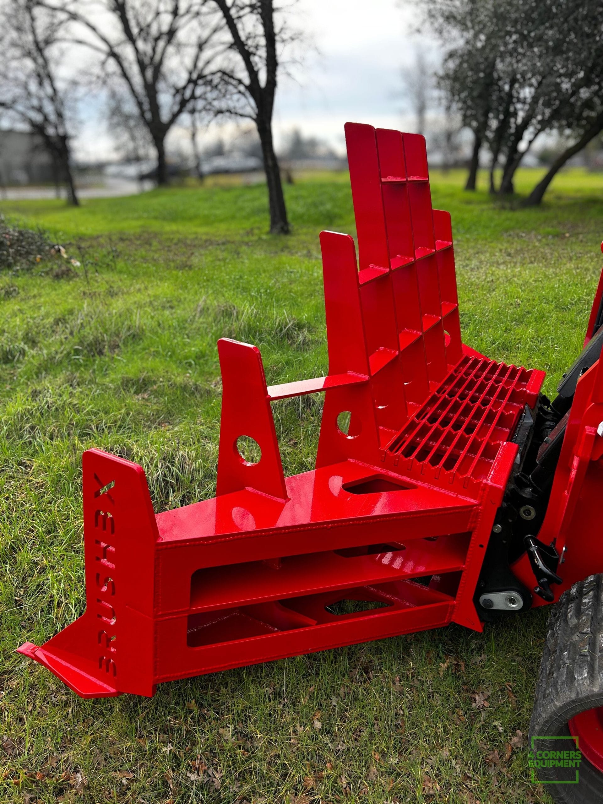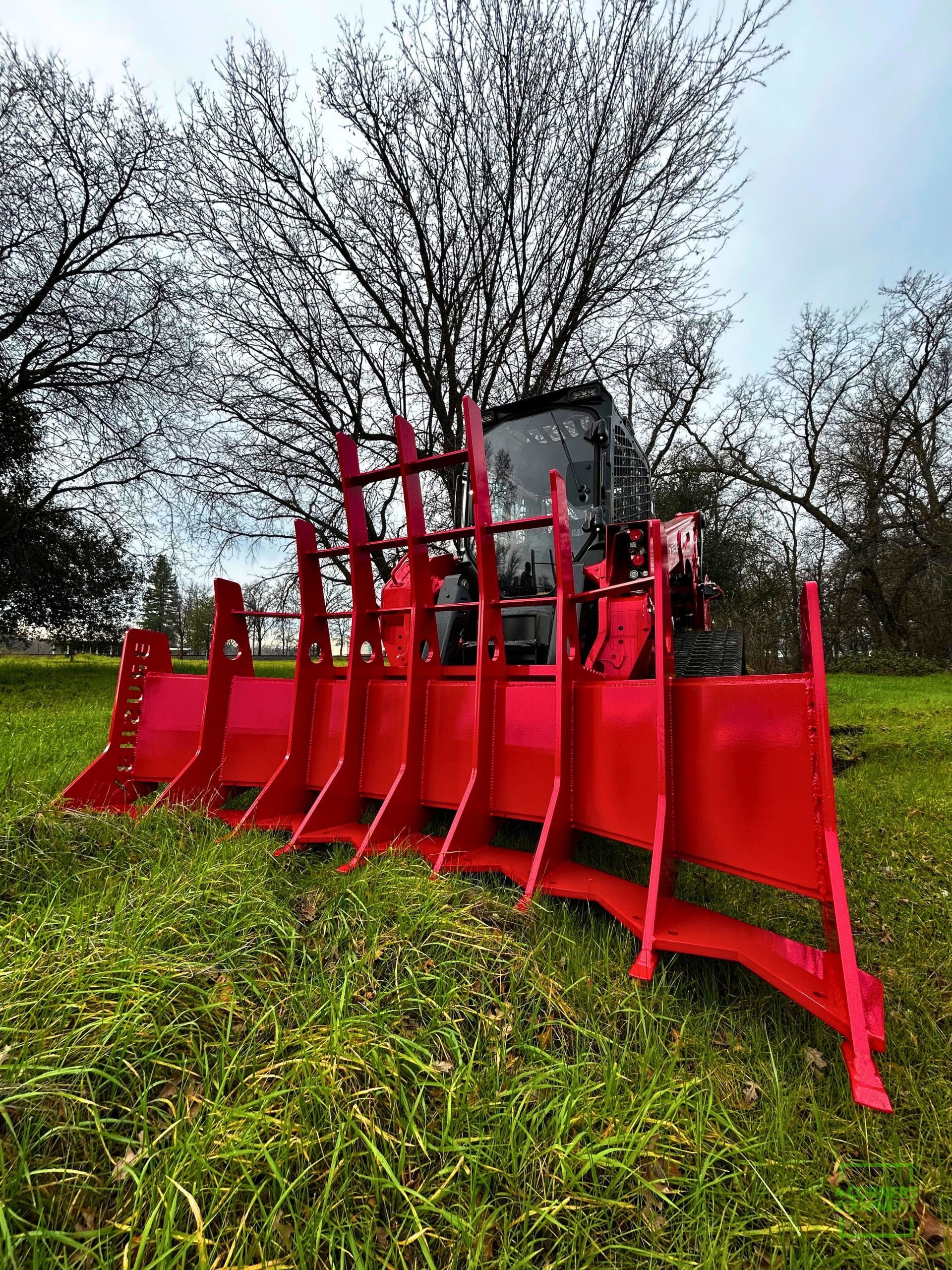 The crescent-shaped tine design grips and contains material, allowing operators to push brush without constant spillover, while also enabling precise work around standing trees without snagging or damaging them. Built from 3/4-inch and 3/8-inch steel plate, weighing 1,730 lbs and spanning 96 inches wide, the BRUSHBX is engineered for sustained, aggressive work.